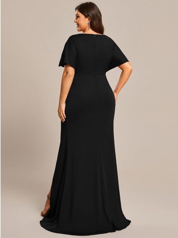 Elegant Plus Size Deep V-Neck Pleated Evening Gown with High Split