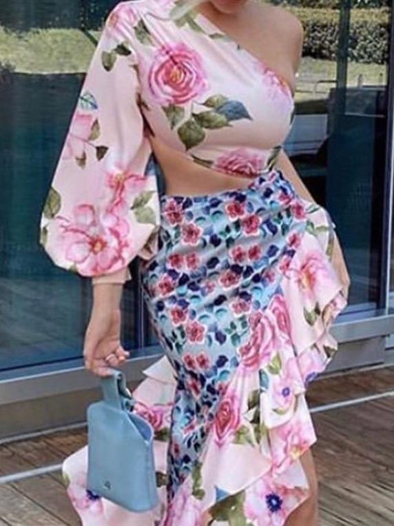 Women’s Dresses Asymmetric Off Shoulder One-Sleeve Flower Ruffled Dress